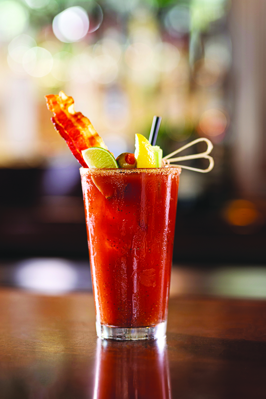 Bloody Mary Cocktail drink in pint glass on wood bar counter 3rd Annual Bloody Fest