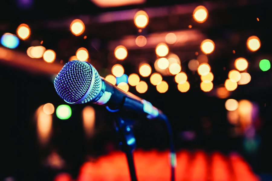 Microphone stand in an event hall, lights, no people Jam! Open Mic