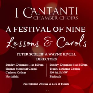 I Cantanti & Le Donne Chamber Choirs Concert: A Festival of Nine Lessons & Carols Directed by Peter Schleif and Dr. Angela Kasper. Freewill exit ... 07 Dec 4:00 pm First English Lutheran Church511 W Belle St, Cannon Falls, 55009